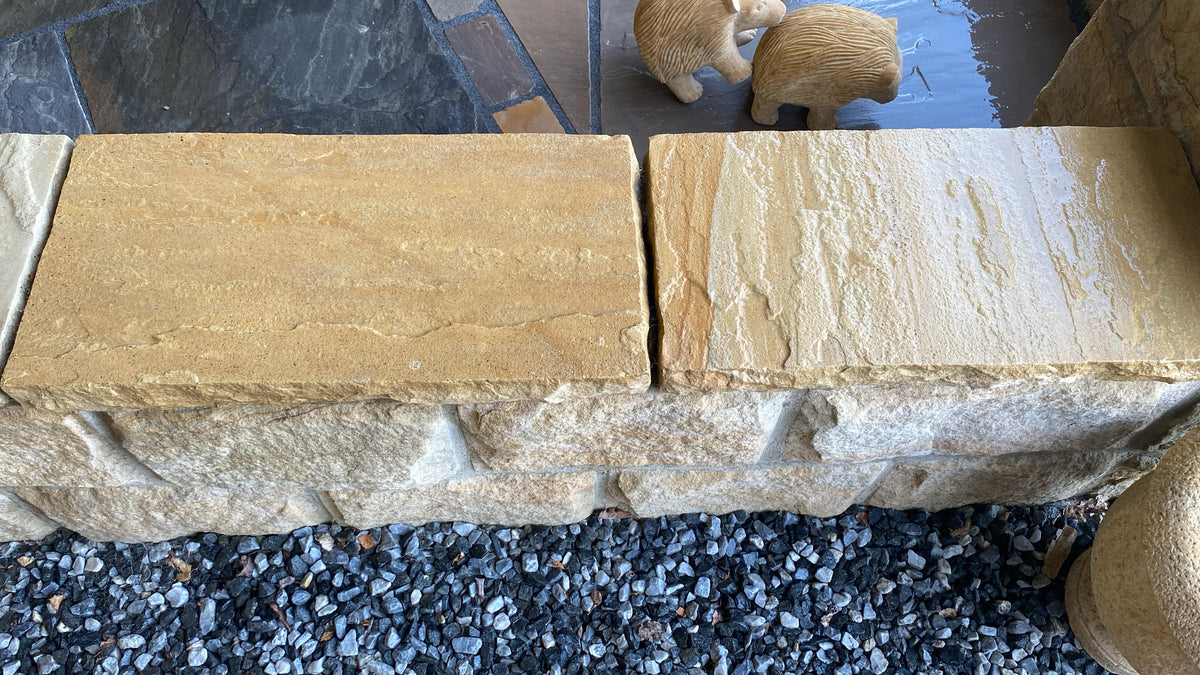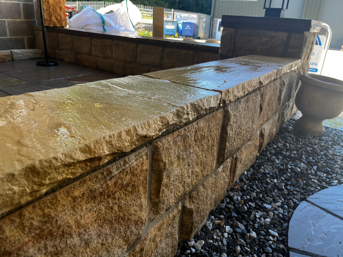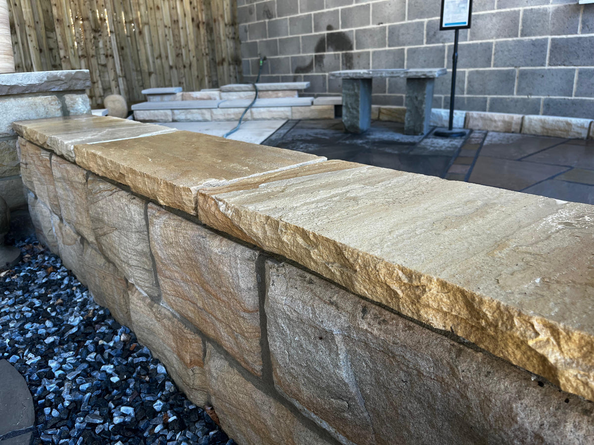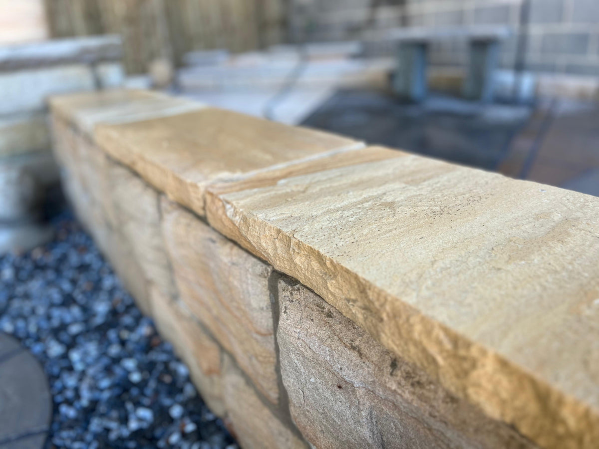 Finish your garden walls with the timeless charm of Whitby Riven Sandstone Coping Stones – offering warmth, weather resistance and natural beauty in every piece.
